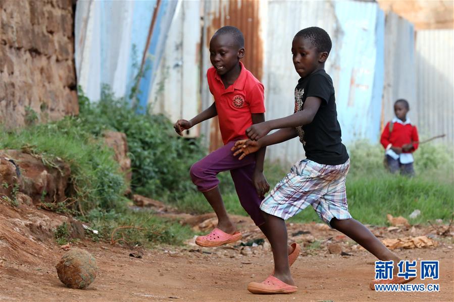 10月16日,在肯尼亞內(nèi)羅畢基貝拉貧民窟,兩名兒童在路邊踢足球。新華社記者王騰攝