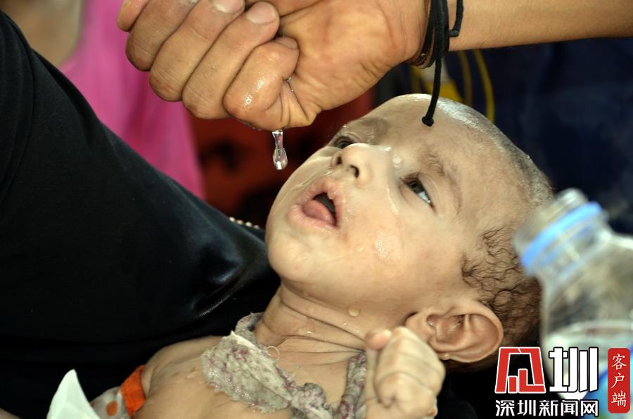 當(dāng)?shù)貢r(shí)間2017年7月4日,伊拉克摩蘇爾,一名救援人員給一名缺水的兒童喂水。