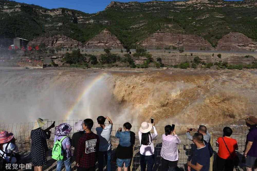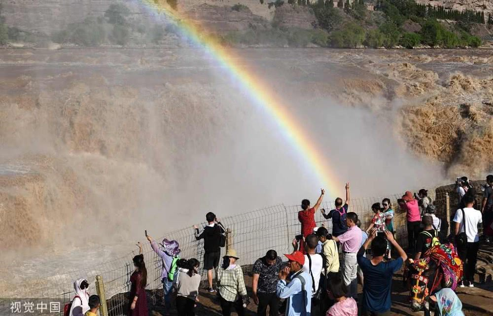 2019年8月17日,山西臨汾,游客在吉縣黃河壺口瀑布欣賞“彩虹門(mén)”景觀。