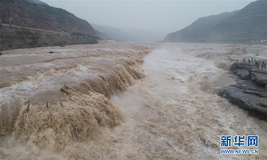 受近日降雨影響,位于山西吉縣的壺口瀑布水量增大,壯美的瀑布群景觀吸引眾多游客前來(lái)觀賞。新華社記者楊晨光攝
