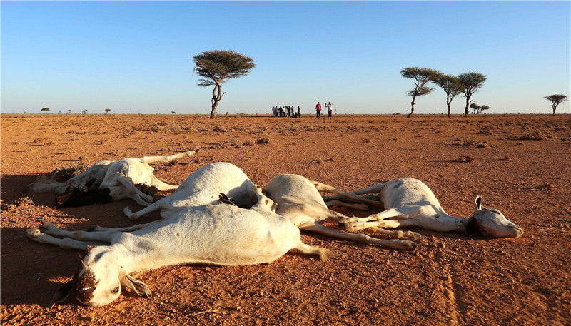 當?shù)貢r間2016年12月15日,索馬里邦特蘭,干旱的土地上散布著羊的尸體。當?shù)卦庥龈珊堤鞖猓笫艿轿:Α?/p>