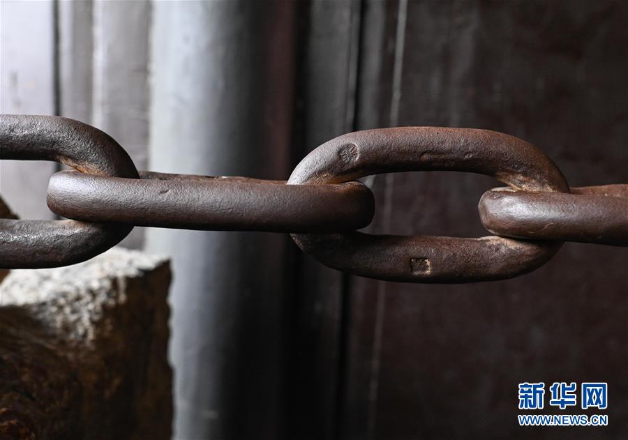 瀘定橋的鎖鏈總共有12164個鐵環(huán)相扣,現(xiàn)今仍可在鐵環(huán)上看到一些獨特的標(biāo)記(6月27日攝)。 新華社記者 江宏景 攝
