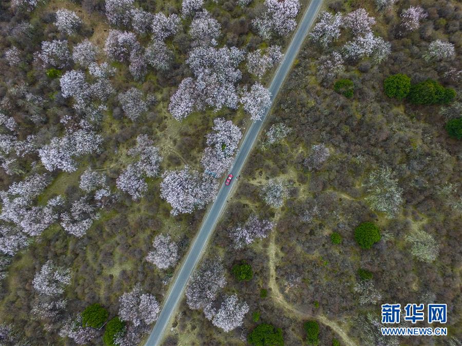 這是經(jīng)過林芝波密境內(nèi)桃花叢的公路(2016年4月1日無人機(jī)拍攝)。 新華社記者 普布扎西 攝