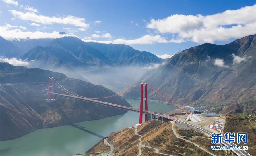 俯瞰雅康高速瀘定大渡河大橋(10月16日無人機(jī)拍攝)。該橋主橋為1100米單跨鋼桁梁懸索橋,2018年底建成通車。 新華社記者 江宏景 攝