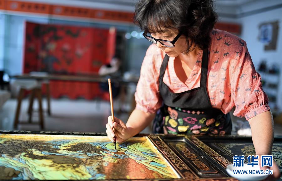 北京金漆鑲嵌有限責任公司工藝美術大師胡昕在創(chuàng)作漆畫屏風(9月19日攝)。新華社記者李欣攝