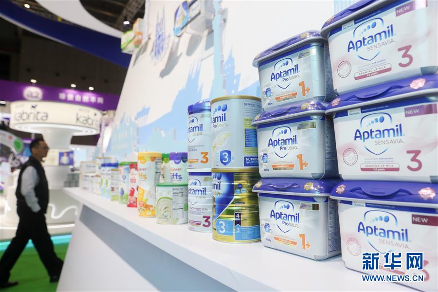 11月5日,在第二屆進(jìn)博會食品及農(nóng)產(chǎn)品展區(qū),參觀者從達(dá)能展臺經(jīng)過。新華社記者丁汀攝
