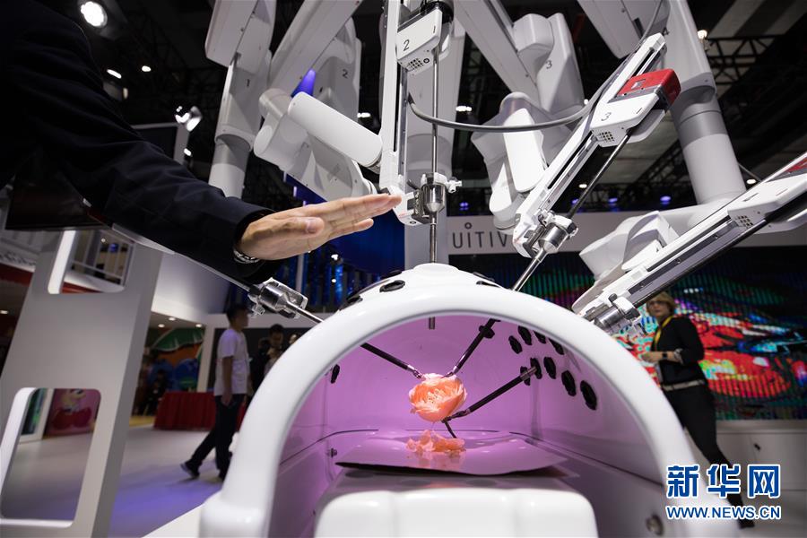 這是在第二屆進博會醫(yī)療器械及醫(yī)藥保健展區(qū)拍攝的機器人輔助腹腔鏡手術系統(tǒng)(11月7日攝)。新華社記者金立旺攝