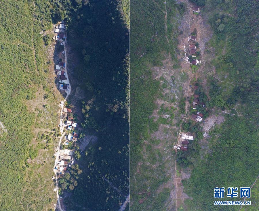 拼版照片:左圖為剛剛修通水泥路的大化瑤族自治縣板升鄉(xiāng)八好村弄研屯(11月11日無人機拍攝);右圖為尚未通路的八好村弄研屯(2015年11月3日無人機拍攝)。新華社記者 黃孝邦 攝