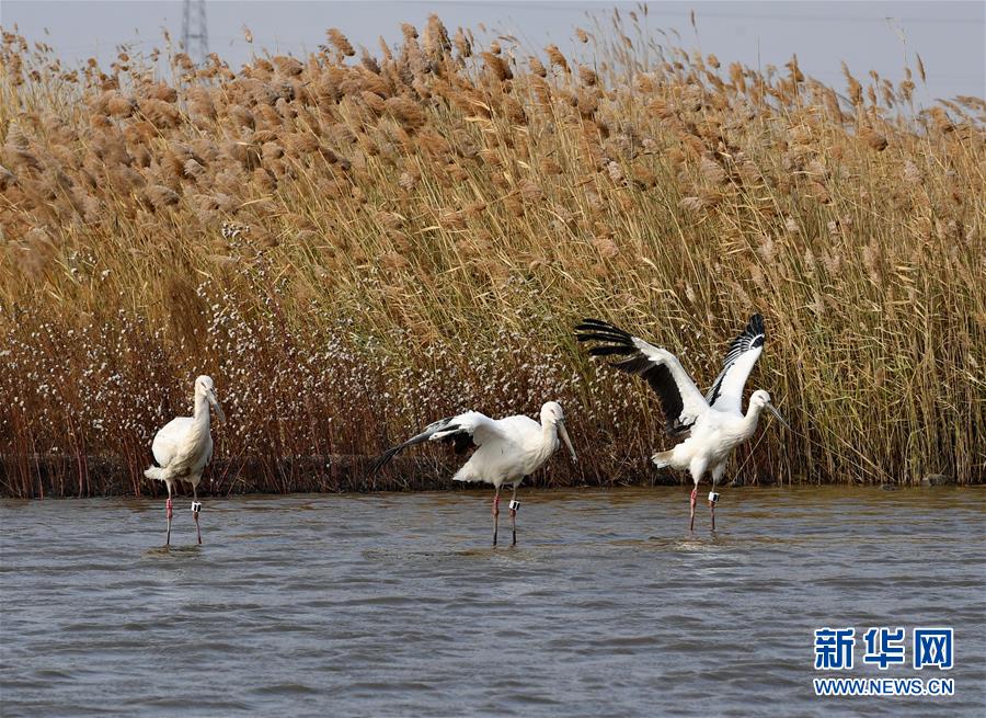 這是在樂亭縣野生動物保護(hù)協(xié)會大清河鳥類救助站放飛回歸大自然的三只國家一級保護(hù)動物東方白鸛(11月16日攝)。新華社記者楊世堯攝