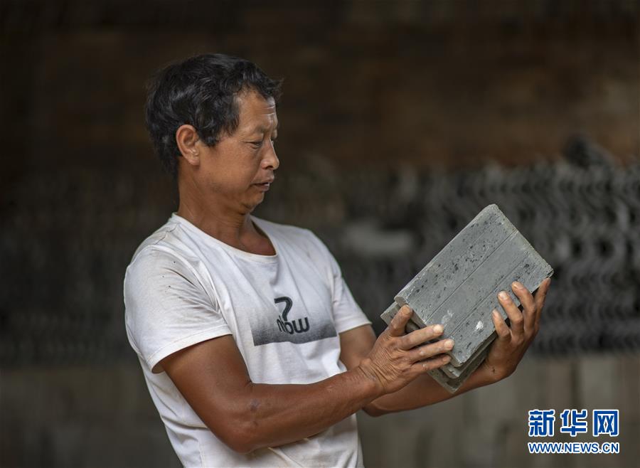石屏縣異龍鎮(zhèn)符家營村村支書楊松在挑選準(zhǔn)備用于修繕老屋的地磚(8月8日攝)。新華社記者江文耀攝