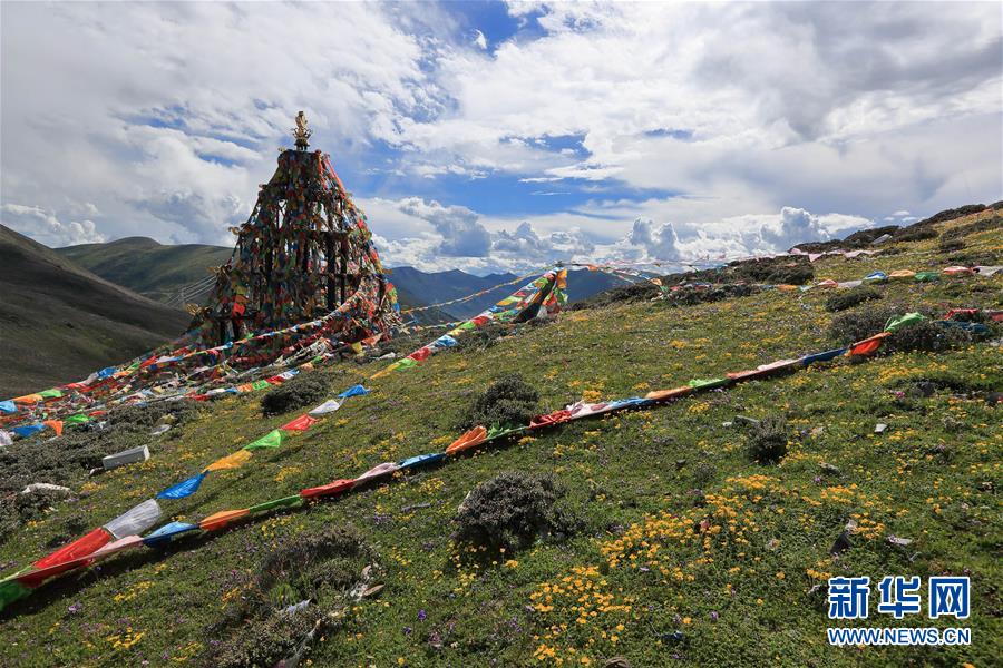 在川藏公路四川折多山埡口,藍天白云與經(jīng)幡、草地、鮮花構(gòu)成一幅美麗畫卷(6月28日攝)。新華社記者江宏景攝