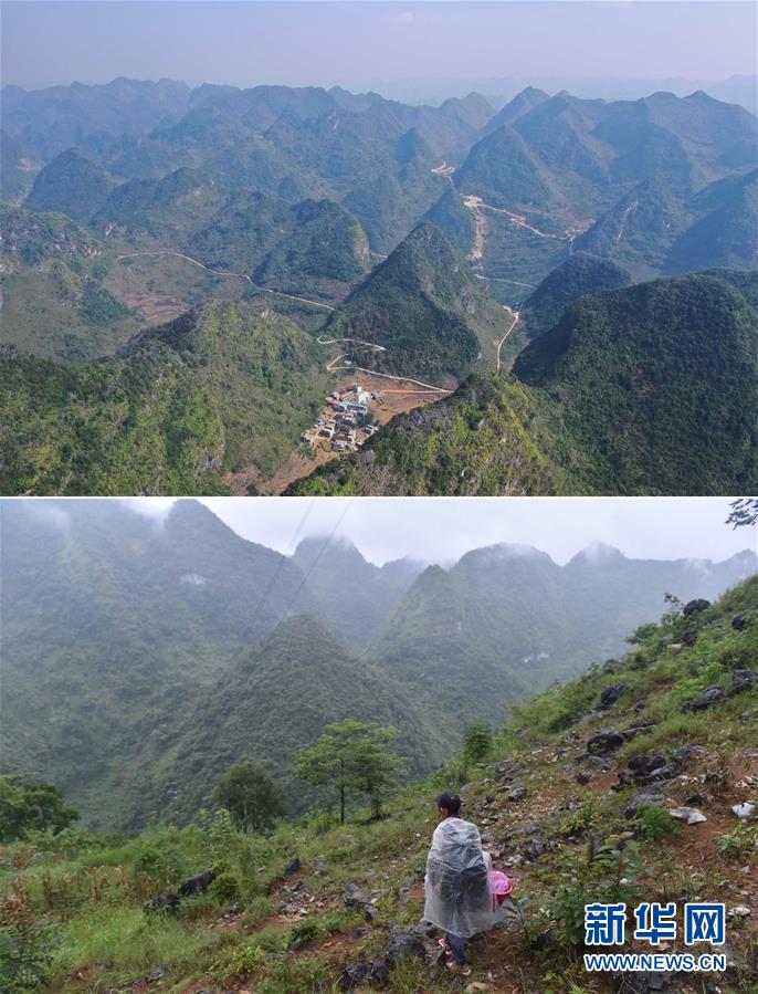 拼版照片:上圖為已經(jīng)修通水泥路的大化瑤族自治縣板升鄉(xiāng)八好村八好屯(11月11日無人機(jī)拍攝);下圖為在尚未通路的八好村八好屯,村民背著化肥走山路回家(2016年4月15日攝)。新華社記者黃孝邦攝