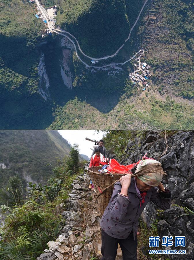 拼版照片:上圖為已經(jīng)修通水泥路的大化瑤族自治縣板升鄉(xiāng)八好村八好屯(11月11日無人機(jī)拍攝);下圖為在尚未通路的八好村八好屯,村民背著年貨走山路回家(2016年1月26日攝)。新華社記者黃孝邦攝