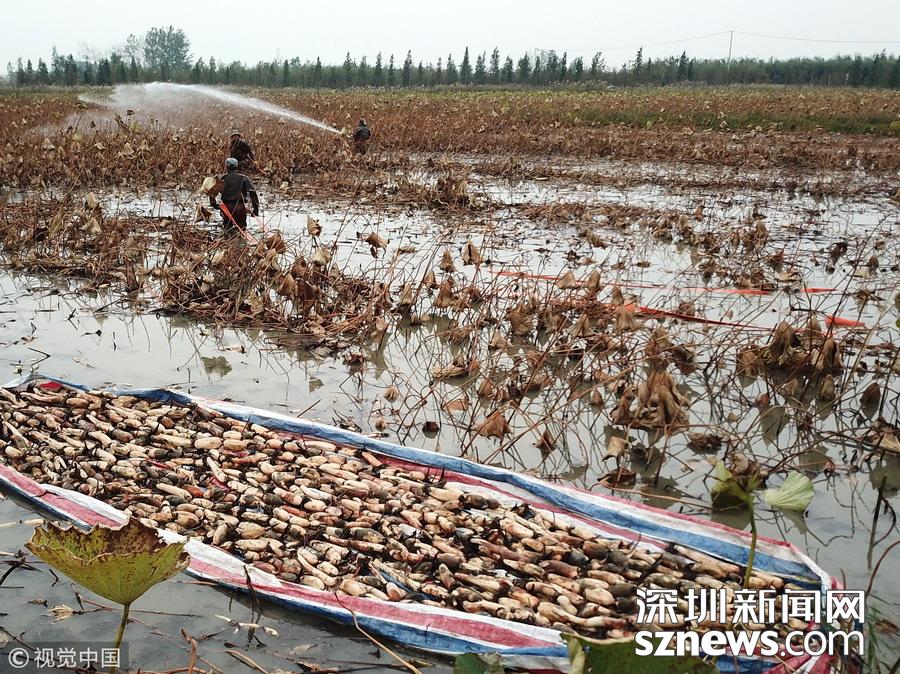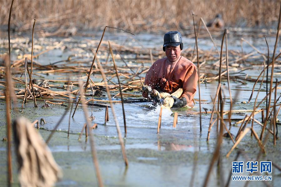 11月18日,工人在采收蓮藕。初冬時(shí)節(jié),河北省唐山市曹妃甸蓮藕豐收,工人們?cè)诮Y(jié)冰之前忙著采收蓮藕。新華社記者楊世堯攝