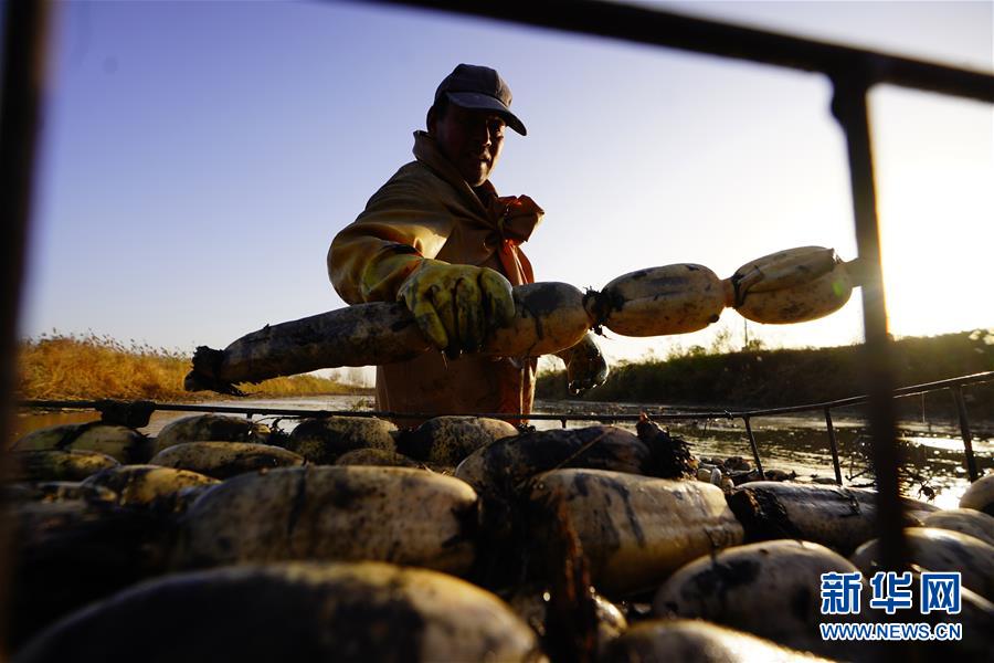 11月18日,工人在采收蓮藕。初冬時節(jié),河北省唐山市曹妃甸蓮藕豐收,工人們在結(jié)冰之前忙著采收蓮藕。新華社記者邢廣利攝