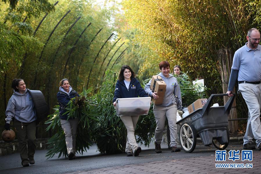 11月19日,在美國(guó)華盛頓的美國(guó)國(guó)家動(dòng)物園,飼養(yǎng)員運(yùn)送竹子、水果、飲用水等,供“貝貝”飛行期間食用。 新華社記者 劉杰 攝