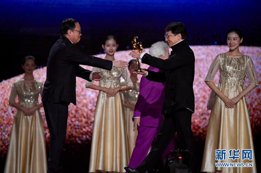 11月23日,電影《流浪地球》獲得最佳故事片獎(jiǎng),成龍?jiān)跒殡娪俺銎贩酱眍C獎(jiǎng)。當(dāng)日,第32屆中國電影金雞獎(jiǎng)?lì)C獎(jiǎng)典禮在福建廈門舉行。新華社記者姜克紅攝