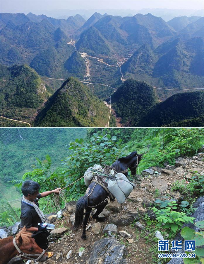 拼版照片:上圖為已經(jīng)修通水泥路的大化瑤族自治縣板升鄉(xiāng)八好村八好屯(11月11日無人機(jī)拍攝);下圖為在尚未通路的八好村八好屯,村民背著化肥走山路回家(2016年4月15日攝)。新華社記者黃孝邦攝