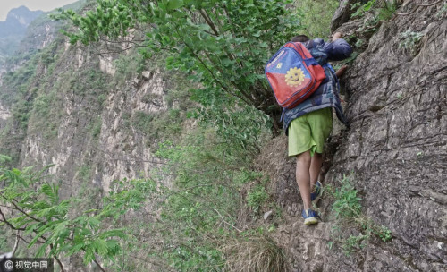 爬山開始前,陳木黑被陳古吉系上背包繩。前面由一個家長引路,中間一個家長,陳古吉帶著陳木黑走最后,6歲的陳木黑已經(jīng)在這條路上,上上下下幾十次了。圖片來源:視覺中國
