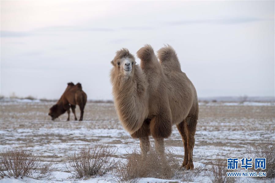 11月24日,兩峰駱駝在新疆吉木乃縣“萬駝園”覓食。新華社記者沙達提攝