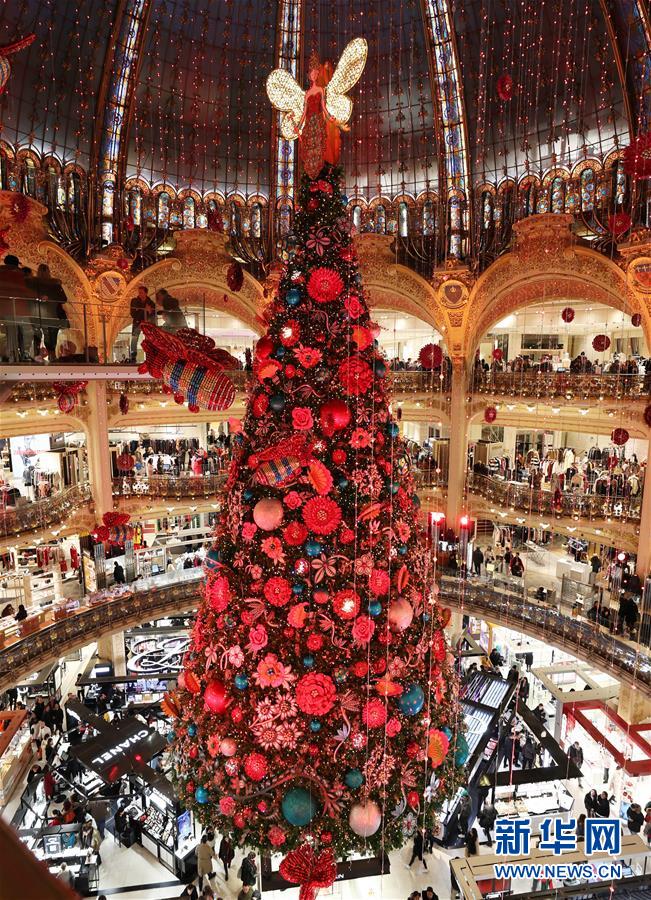 這是11月24日在法國巴黎老佛爺百貨公司拍攝的點(diǎn)燈后的巨型圣誕樹。 新華社記者高靜攝