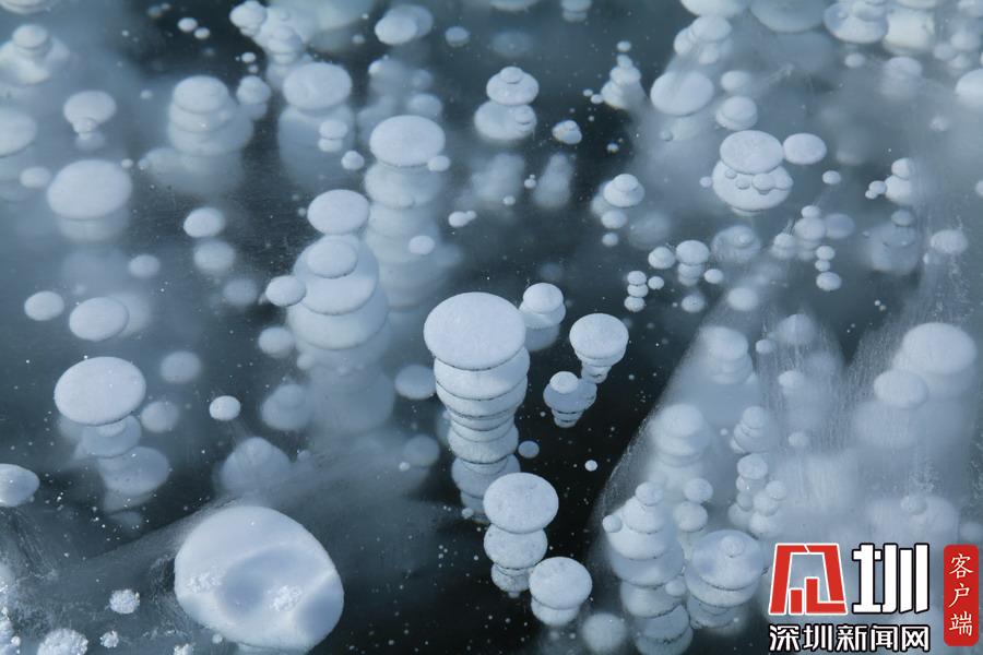 新疆賽里木湖冬季“冰泡”奇觀。
