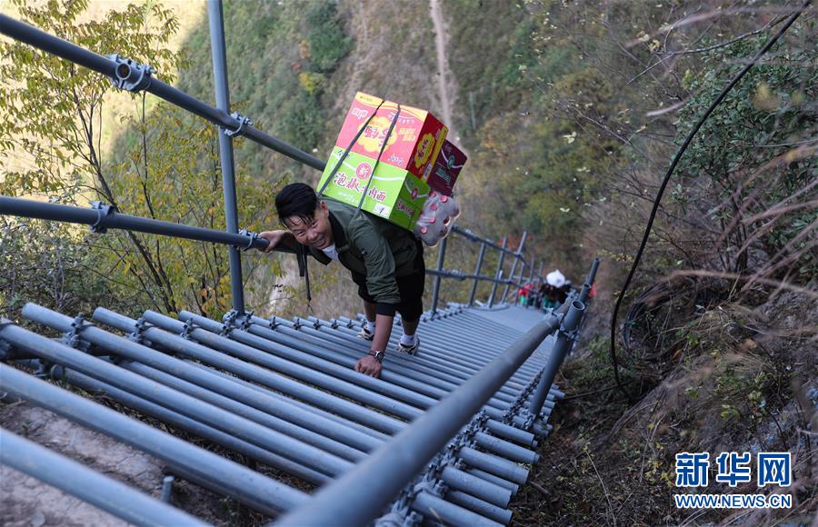 阿土列爾村彝族小伙俄底格哈背著食物攀爬鋼梯(11月24日攝)。新華社記者江宏景攝