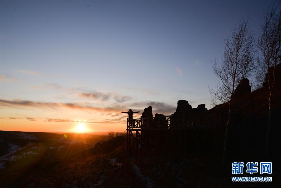 這是11月25日拍攝的克什克騰石陣景區(qū),一名游客張開雙臂面向夕陽(yáng)。 克什克騰石陣景區(qū)位于內(nèi)蒙古赤峰市克什克騰旗,是國(guó)家5A級(jí)景區(qū)。冬日黃昏,在落日和晚霞的映襯下,克什克騰石陣景區(qū)一派壯美景象。