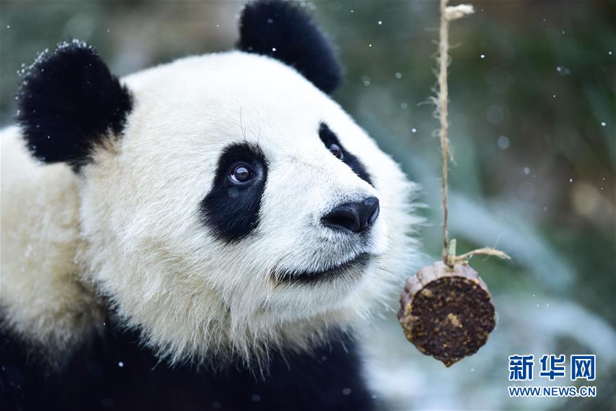 11月29日,在西寧熊貓館內(nèi),一只大熊貓在吃飼養(yǎng)員投送的食物。 新華社記者 吳剛 攝