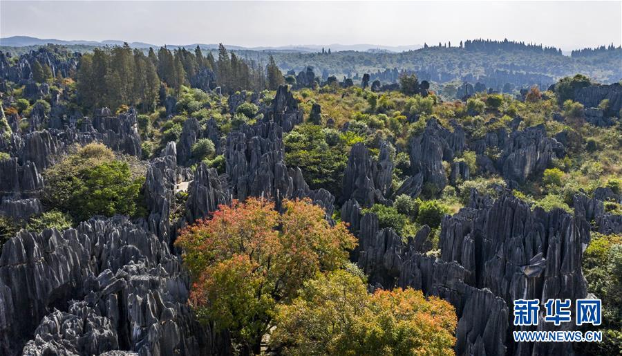 11月28日,游客在石林景區(qū)游覽(無人機拍攝)。新華社記者江文耀攝