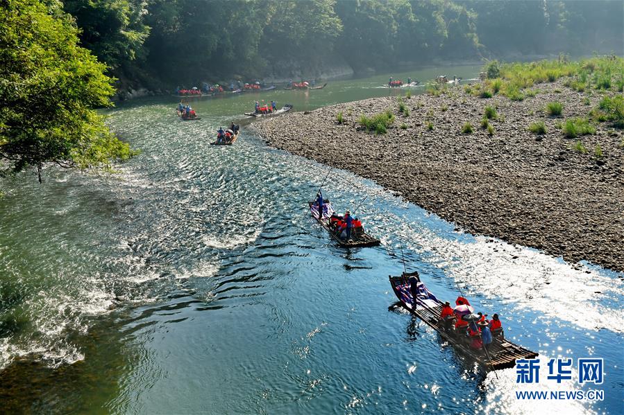 8月23日,游客在武夷山九曲溪乘竹筏游覽。暑期即將接近尾聲,福建武夷山游客仍絡繹不絕。盡管2019年暑期武夷山兩次遇到暴雨災害造成景區(qū)關(guān)閉,在當?shù)芈糜尾块T的努力下很快恢復旅游秩序。新華社記者張國俊攝