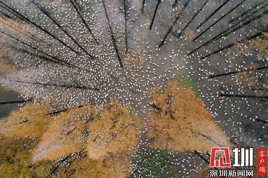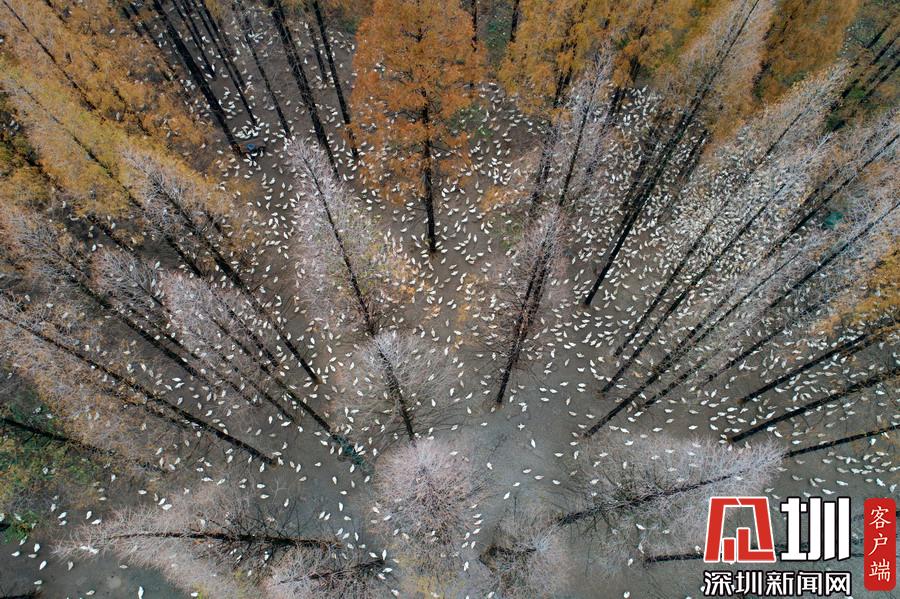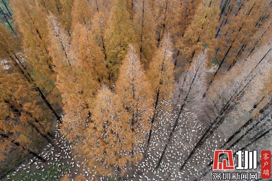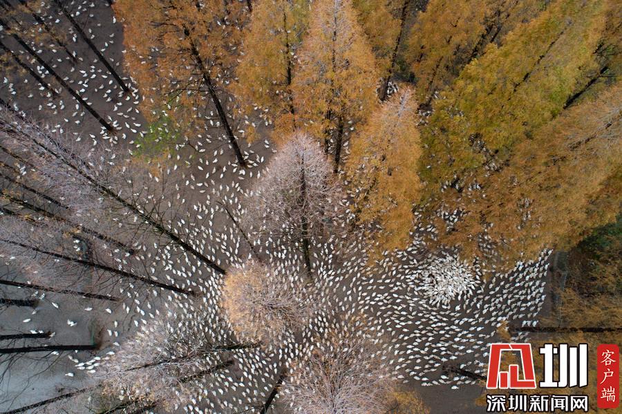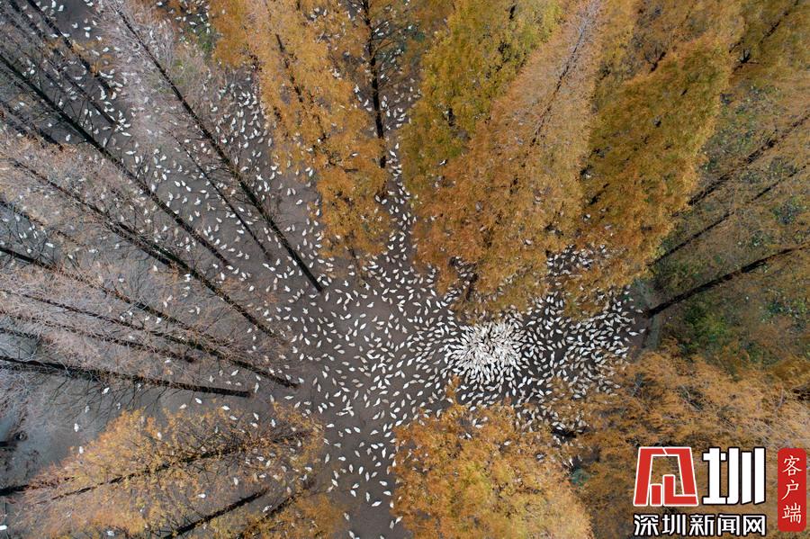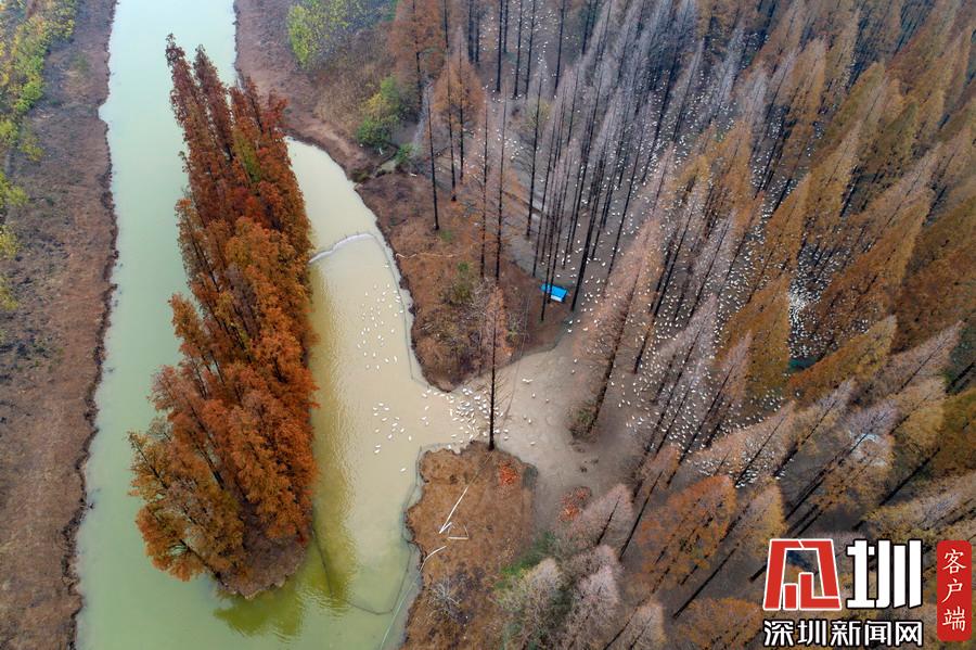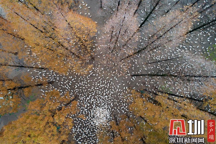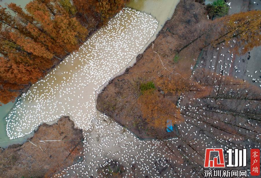 2019年12月1日,江蘇省宿遷市泗洪縣,航拍5000多只四季鵝在陳?ài)琢謭?chǎng)的樹(shù)林下吃食的壯觀場(chǎng)景。