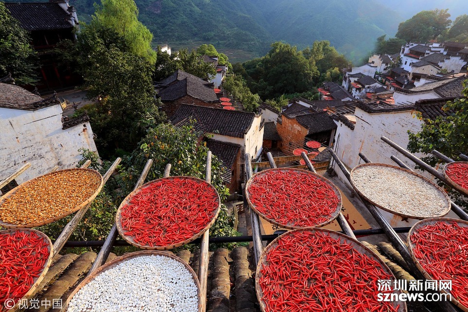 當(dāng)日立秋節(jié)氣,江西婺源縣篁嶺古村的農(nóng)作物普遍豐收,村民們又迎來了一年一度的“曬秋”季。