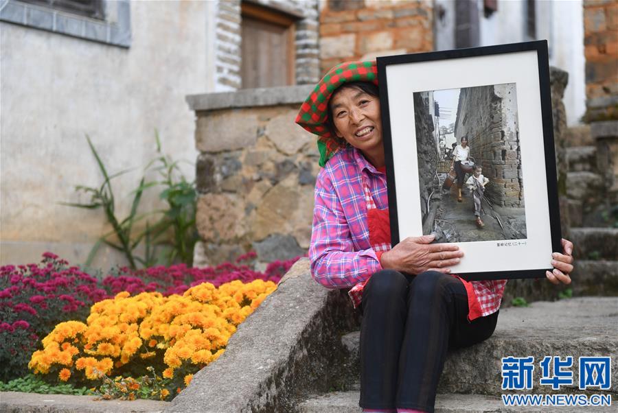 篁嶺村村民曹細(xì)香拿著2010年自己的老照片在家門前留影(11月7日攝)。新華社記者胡晨歡攝