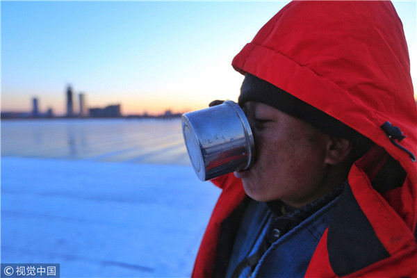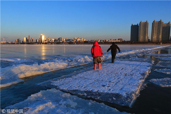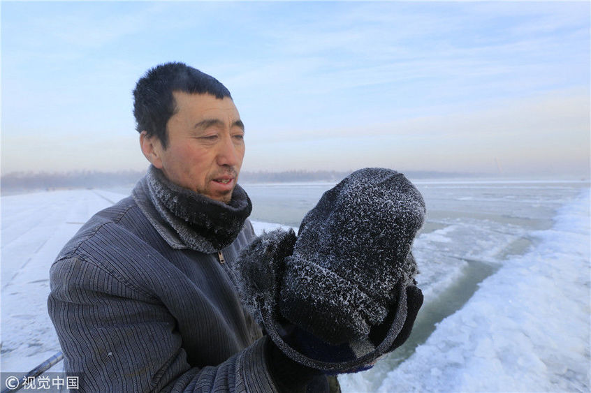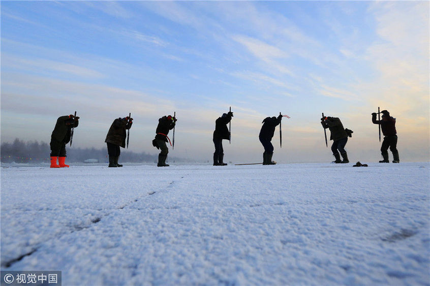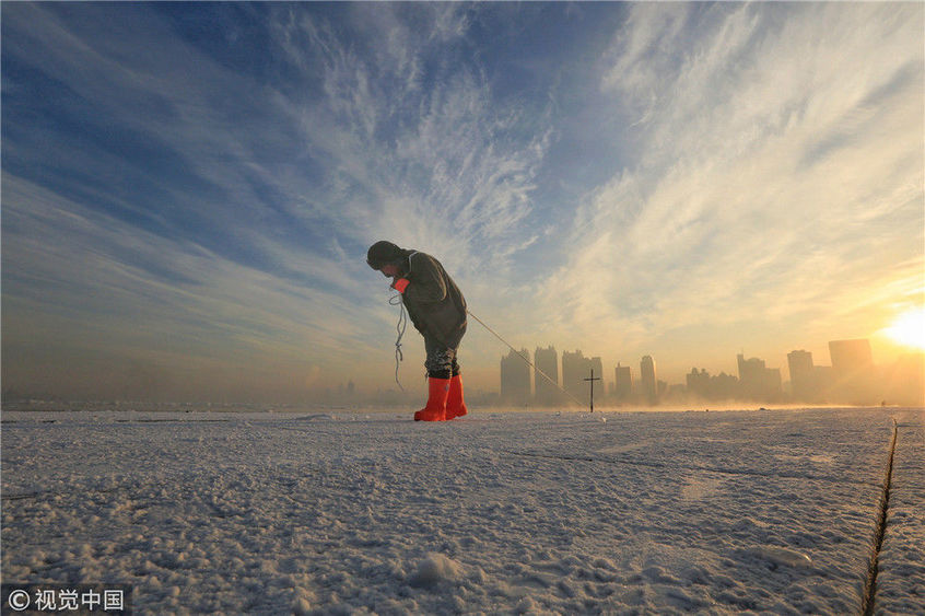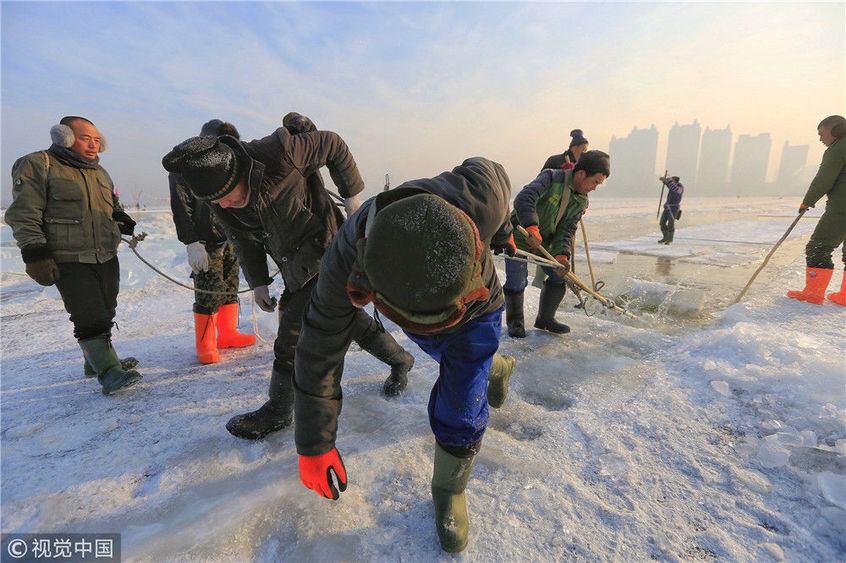 2018年12月11日,黑龍江省哈爾濱市,松花江上,采冰者們彎腰拉繩,宛如纖夫般拽重達半噸的冰塊出水。采冰者都是自哈市江北萬寶、東發(fā)、沙陀子等鄉(xiāng)鎮(zhèn)的農民,他們每年冬閑時都會親屬、村鄰之間結伴到松花江畔采冰,有的采冰人,已經連續(xù)干了二十多年。每個采冰季,他們每天要在冰面上工作10-12個小時,每個采冰組,一天要拽出冰塊2000-3000塊,一個近20天的采冰季,每人能收入近萬元。視覺中國