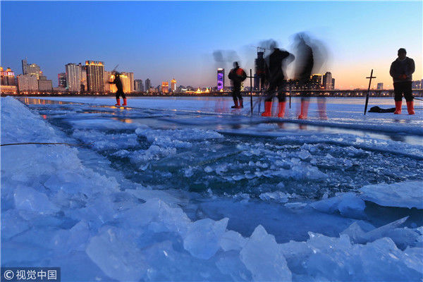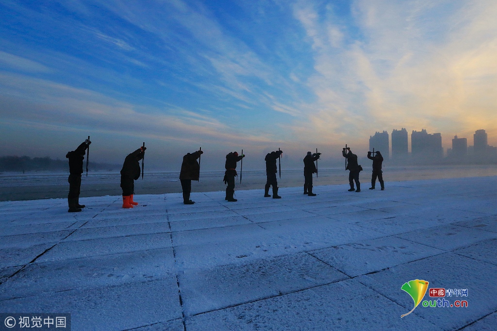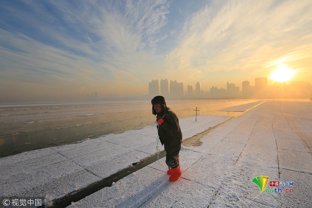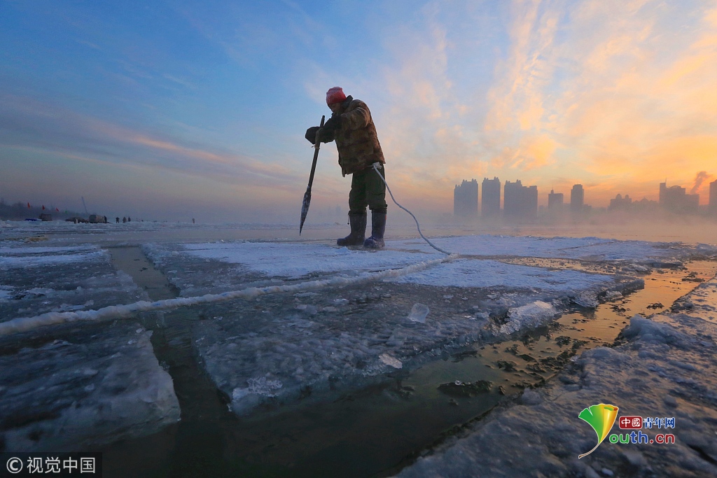 中國青年網2018年12月13日訊2018年12月11日,黑龍江省哈爾濱市,松花江上,采冰人在漫天霞光中破冰、采冰,金色光芒在水霧上升騰繚繞,給勞動的場面增添了詩意。