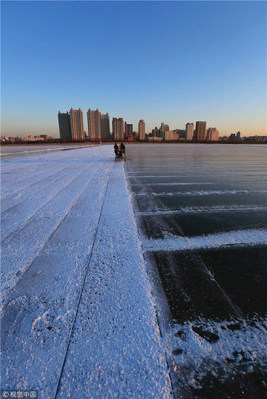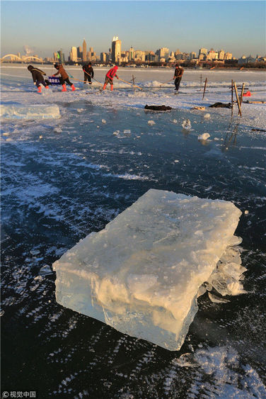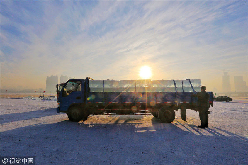 2018年12月8日,最低氣溫零下22度,哈爾濱市江北公路大橋東側的江面上,工人們正在從江中撈取冰塊,裝車運往景區(qū)制作冰燈、冰雕?,F(xiàn)場,工人先是用電鋸、鐵釬將冰分割成半米多寬,一米多長的冰塊,接著將其拉出水面。等候在旁的叉車上前,將冰裝上運冰的卡車,之后裝滿冰塊的卡車駛往景區(qū)。