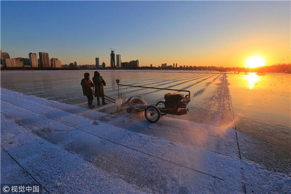 采冰工人迎著晨光在工作。