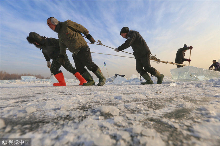 2018年12月11日,黑龍江省哈爾濱市,松花江上,采冰者們彎腰拉繩,宛如纖夫般拽重達(dá)半噸的冰塊出水。采冰者都是自哈市江北萬(wàn)寶、東發(fā)、沙陀子等鄉(xiāng)鎮(zhèn)的農(nóng)民,他們每年冬閑時(shí)都會(huì)親屬、村鄰之間結(jié)伴到松花江畔采冰,有的采冰人,已經(jīng)連續(xù)干了二十多年。每個(gè)采冰季,他們每天要在冰面上工作10-12個(gè)小時(shí),每個(gè)采冰組,一天要拽出冰塊2000-3000塊,一個(gè)近20天的采冰季,每人能收入近萬(wàn)元。