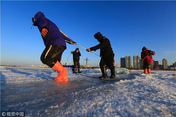 2018年12月08日,黑龍江省哈爾濱市,松花江采冰,今日正式出冰。本次采冰,是為第二十屆哈爾濱冰雪大世界的建造而進(jìn)行。