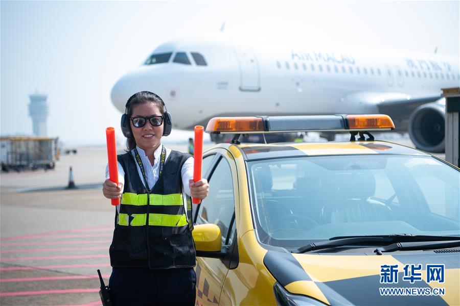 11月25日,澳門國際機(jī)場營運員鄧祺君在機(jī)場指揮飛機(jī)停泊,她已經(jīng)工作了3年。 新華社記者 張金加 攝