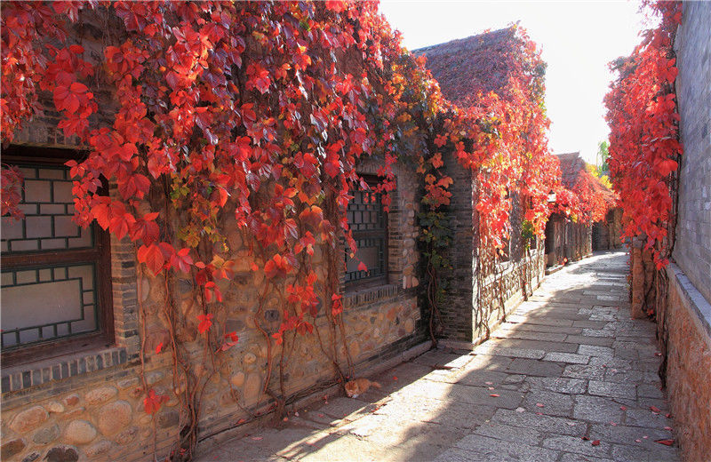 2019年10月30日,北京,古北水鎮(zhèn)秋色正濃,隨處可見(jiàn)的爬山虎蔓莖縱橫,葉子正紅,將水鎮(zhèn)變成了紅葉小鎮(zhèn),美如畫卷。