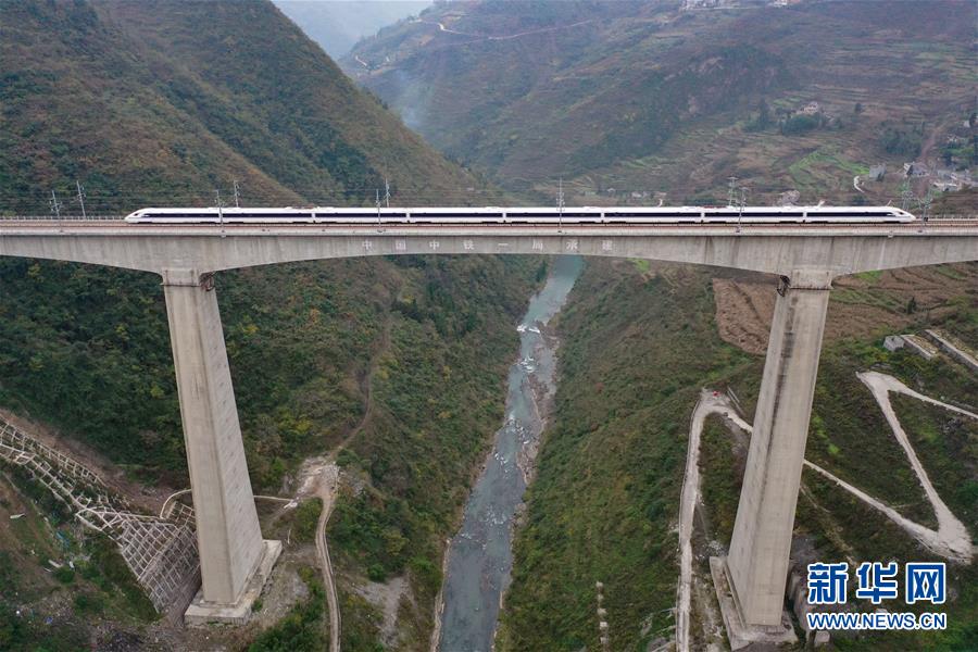 一輛成貴高鐵測試列車駛過香壩河特大橋(12月3日無人機拍攝)。新華社記者劉續(xù)攝