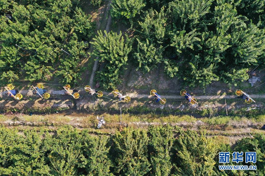 在廣西柳州市鹿寨縣四排鎮(zhèn),村民在果園里采收柑橘(12月11日無(wú)人機(jī)拍攝)。部分柑橘通過(guò)李柳萍的電商平臺(tái)外銷。新華社記者黃孝邦攝
