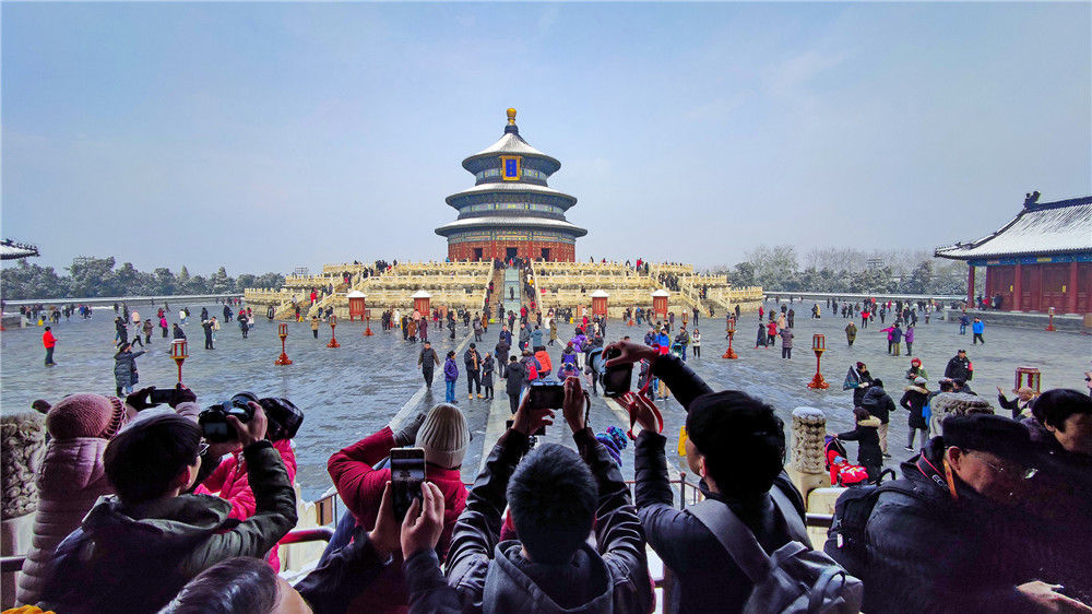 2019年11月30日,北京,初雪過(guò)后,天壇公園銀裝素裹,白雪古建相互映襯,景色迷人。天壇公園里觀雪賞景的市民絡(luò)繹不絕。喬健/千龍圖像/視覺(jué)中國(guó)