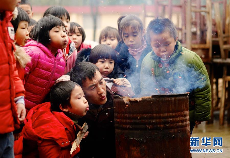 1月3日,在江西省鷹潭市余江區(qū)春濤鎮(zhèn)黃泥小學,老師章站亮(前右)和學生們一起生火。由于生火用的材料均是廢棄的桌椅或者枯葉,點火后得不停地靠嘴吹氣才能燒得旺盛。2018年9月,44歲的章站亮來到黃泥小學擔任校長,黃泥小學物質條件艱苦,沒有食堂。他每月自費買菜為孩子們義務加餐,被孩子們稱為“廚神爸爸”。新華社記者胡晨歡攝