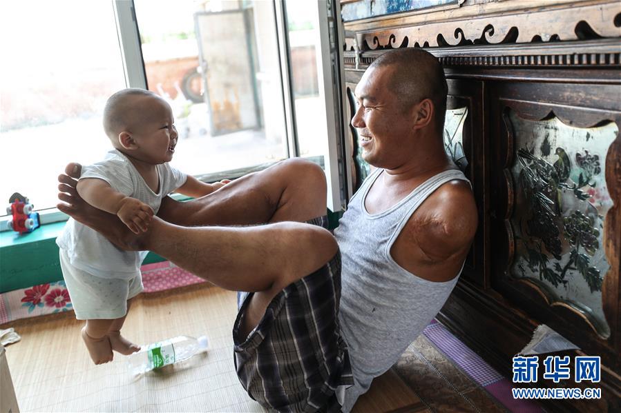 8月8日,王剛與兒子“肉肉”在家中玩耍。33歲的王剛來自遼寧省鐵嶺市昌圖縣兩家子鎮(zhèn)河西村。作為父親,王剛雖然沒有堅(jiān)實(shí)的臂膀去擁抱自己的孩子,但他一直努力用自己的方式呵護(hù)照顧家人。“無臂爸爸”的父愛給很多人帶來了力量和鼓舞,被人親切地稱為“最強(qiáng)爸爸”。新華社記者潘昱龍攝
