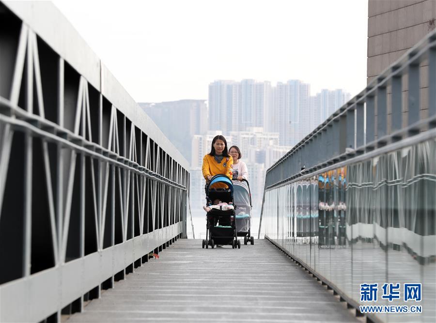 在澳門科學館附近,兩名女士推著嬰兒車過橋(12月17日拍攝)。新華社記者李鋼攝