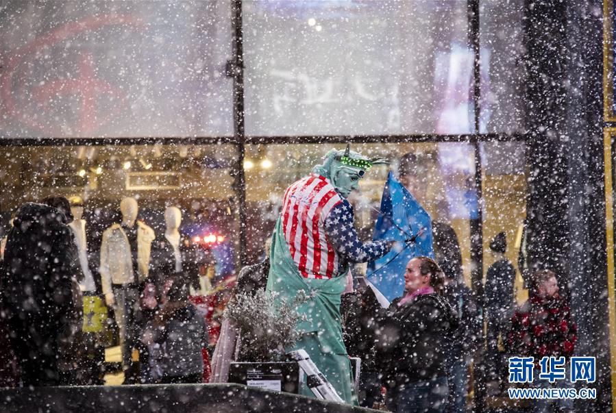 12月18日,在美國紐約時(shí)報(bào)廣場,一名打扮成“自由女神像”的街頭表演者在雪中等待生意。新華社記者 王迎 攝