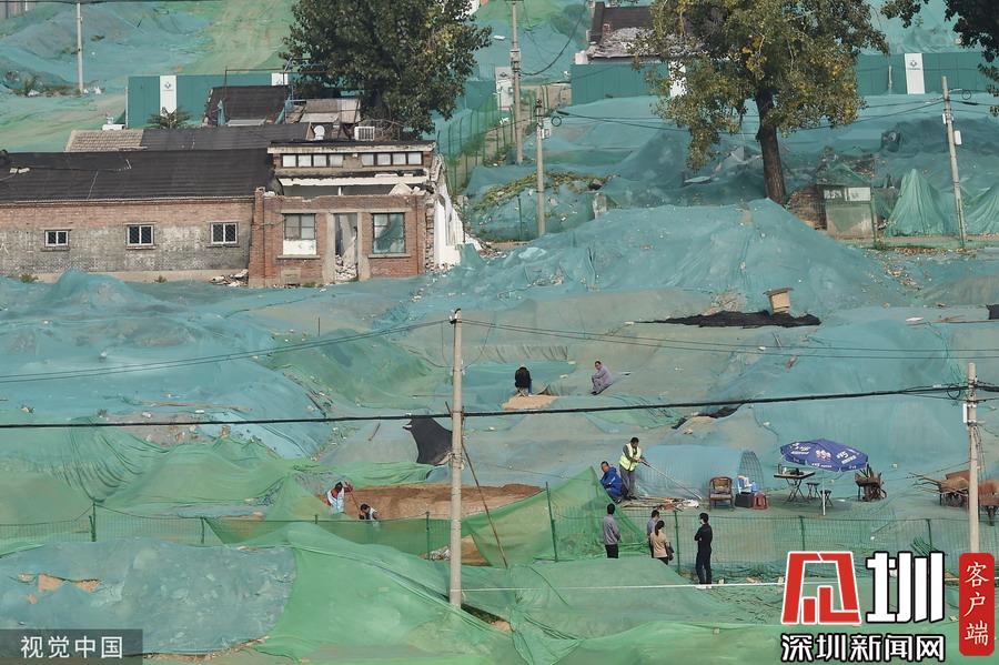 圍擋內(nèi),工地大部分被綠色苫布覆蓋,只露出幾處規(guī)整的探坑??脊殴ぷ髡哒诰o張忙碌中,有些工作人員戴著草帽,坐在馬扎上記錄發(fā)掘細節(jié),還有一些穿著藍色背心的工作人員使用工具正在做清理工作。